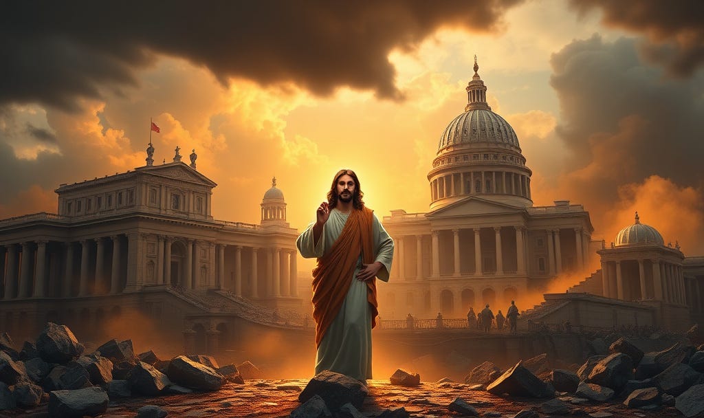This is commentary, not prophecy. Jesus is not actually posing in front of the Capitol like He just filed a divine eviction notice. The whole point is to poke fun at the idea that He ever wanted His kingdom run by earthly bureaucrats in the first place. If you can laugh at empire while remembering He resisted it, you’re reading this exactly right.